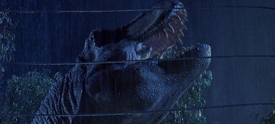 Incapable d’éteindre la puissante lumière, le T-Rex commence à s’agiter autour du véhicule. Spielberg propose alors un plan magnifique : le T-Rex regarde à travers la vitre et la lumière projetée sur son œil fait rétracter sa pupille, rendant alors encore plus menaçante la grosse bestiole déjà particulièrement effrayante.